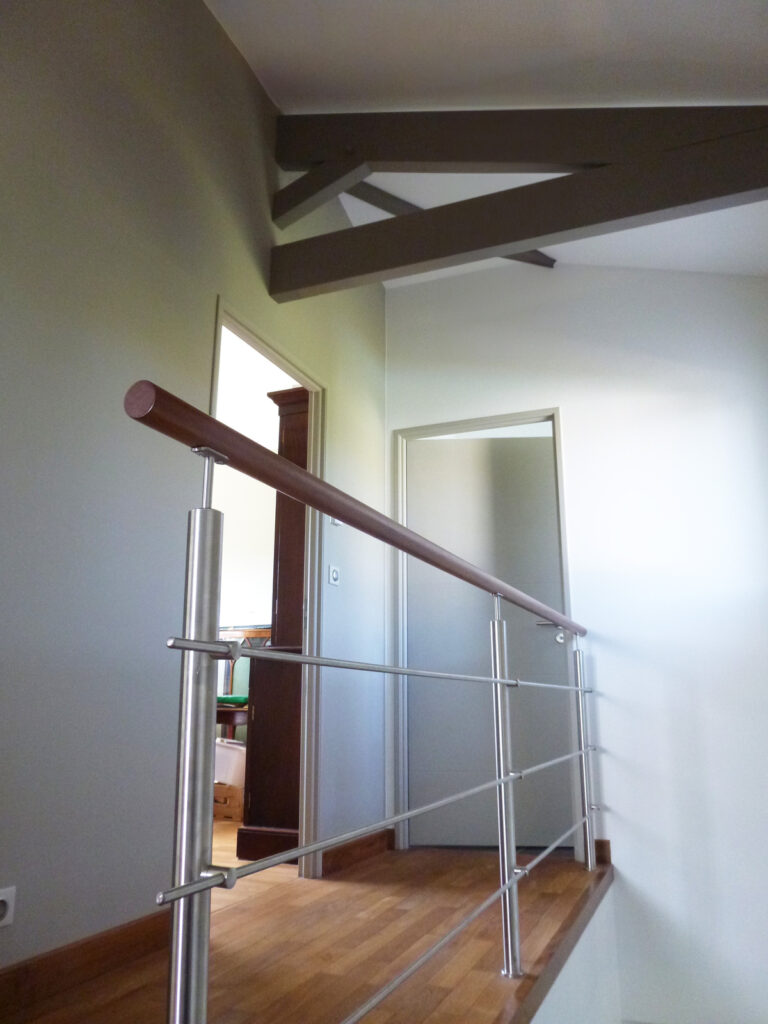 À l’étage, un escalier design aux marches ajourées, agrémenté d’une main courante en bois et d’un garde-corps en inox épuré, mène à la suite parentale. Celle-ci dispose d’un dressing spacieux et d’une salle de bains luxueuse avec un meuble double vasque, une baignoire îlot et une douche à l’italienne ornée de carrelage Porcelanosa.