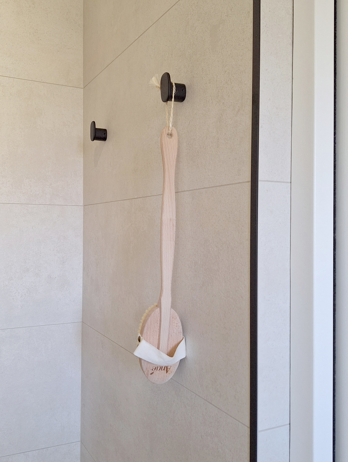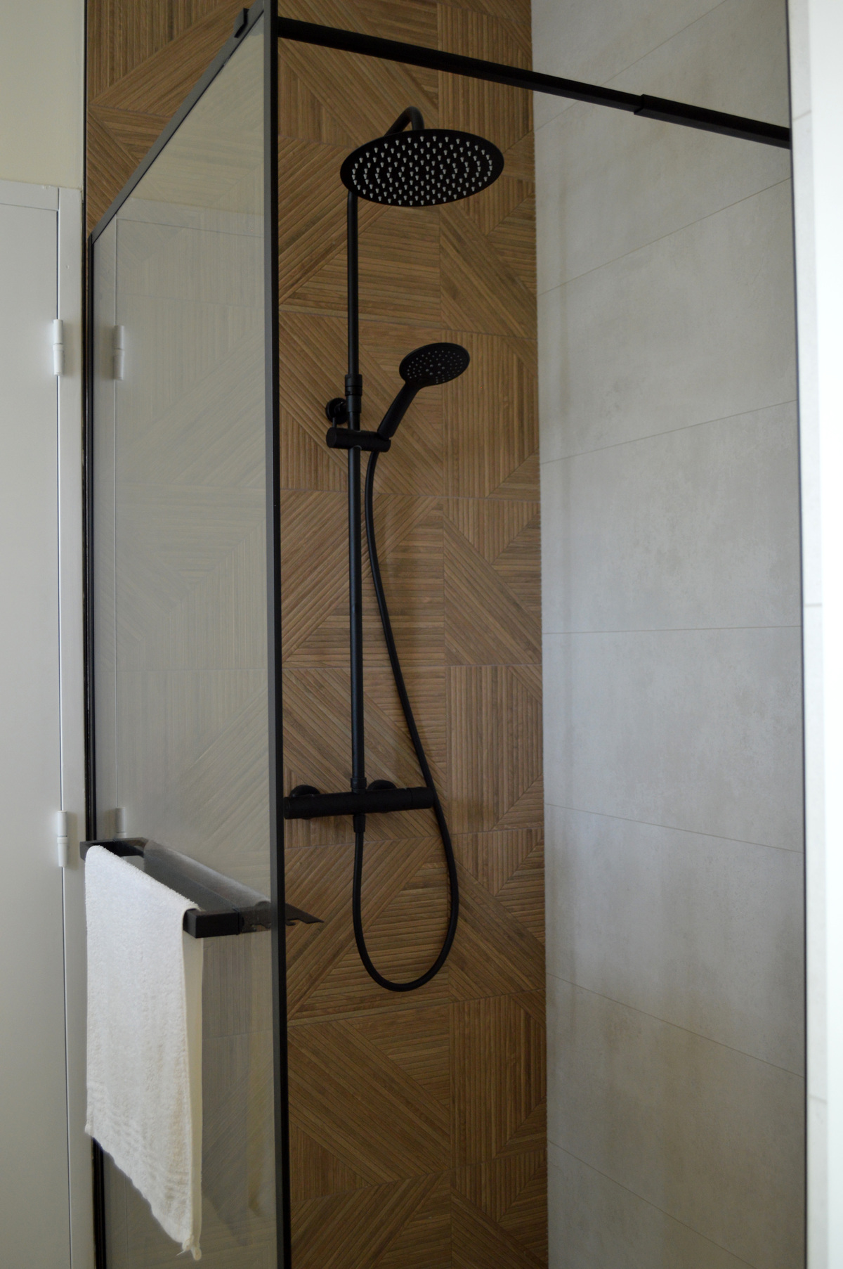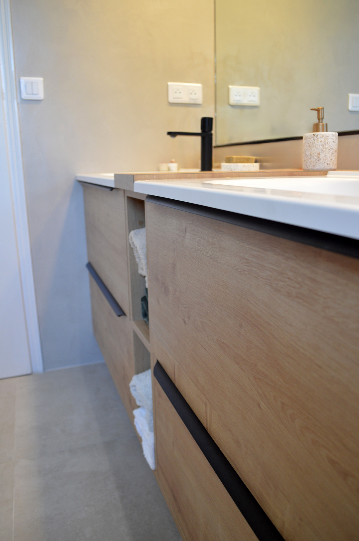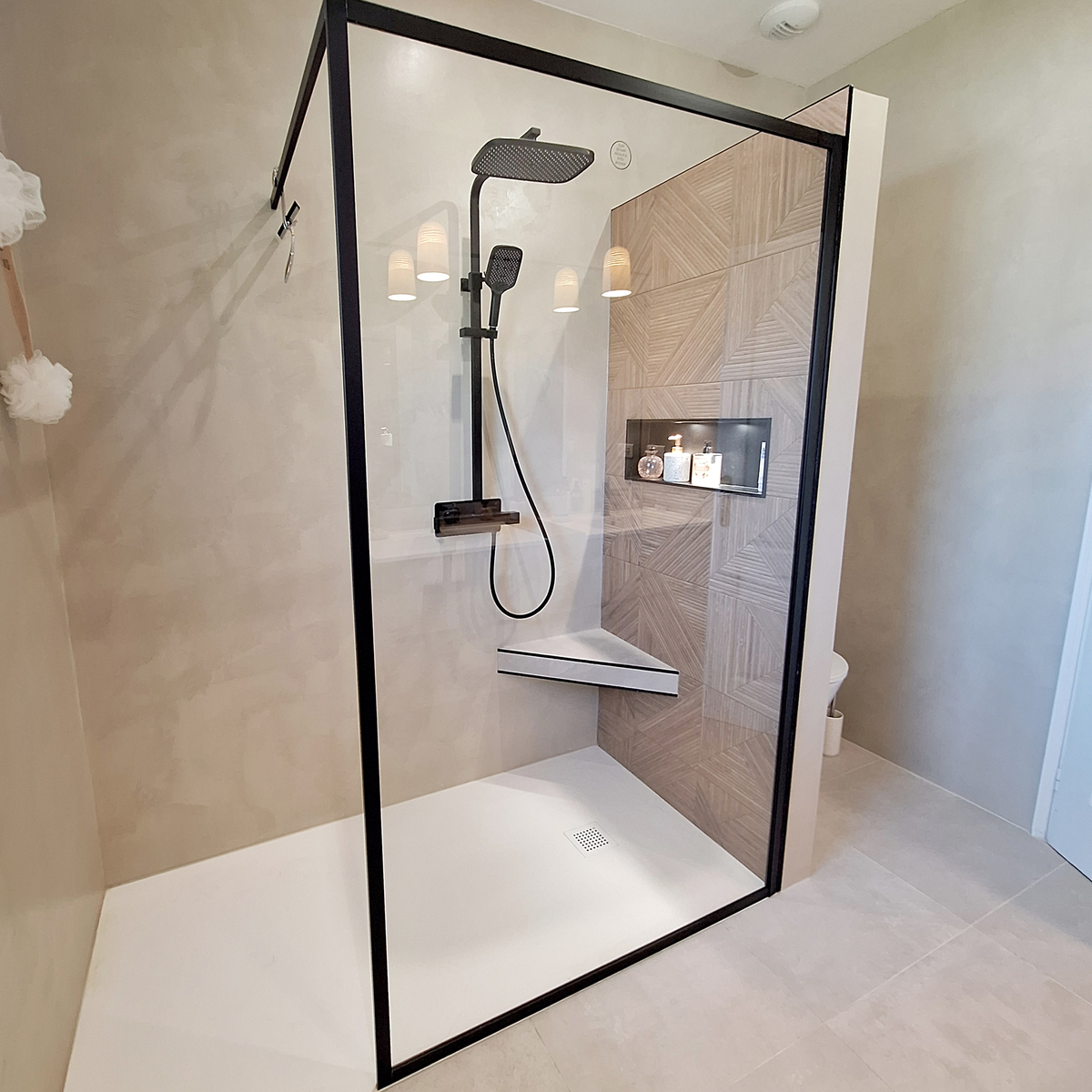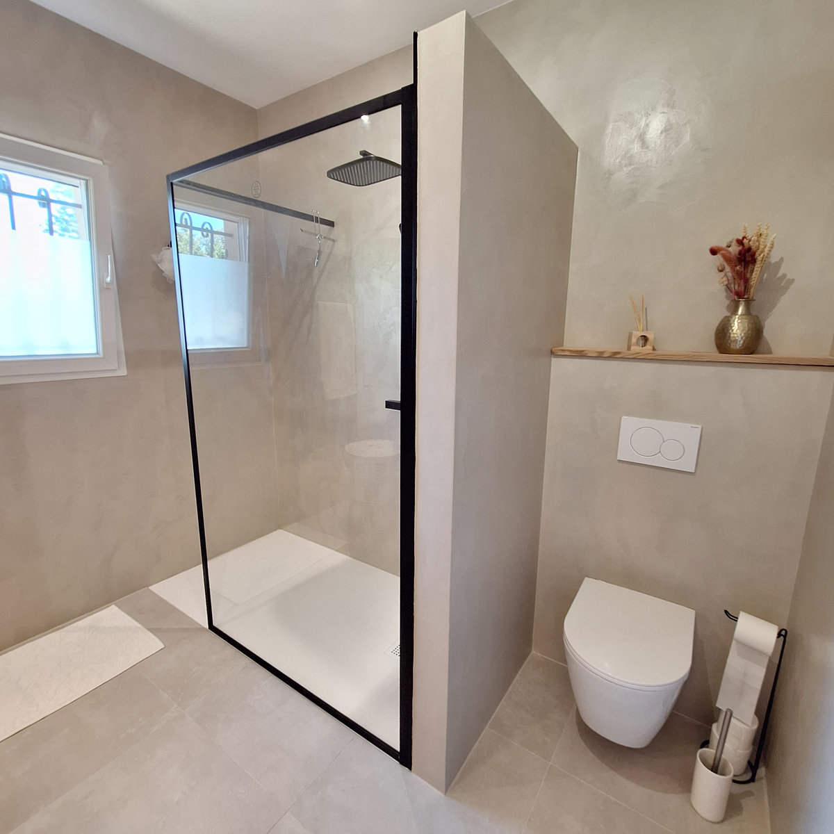 Les teintes beiges diffusent une lumière douce, tandis qu’un carrelage imitation bois réchauffe l’atmosphère et apporte une note naturelle. Des accents noirs, présents dans la robinetterie et les accessoires, structurent l’ensemble et lui donnent une identité graphique affirmée.