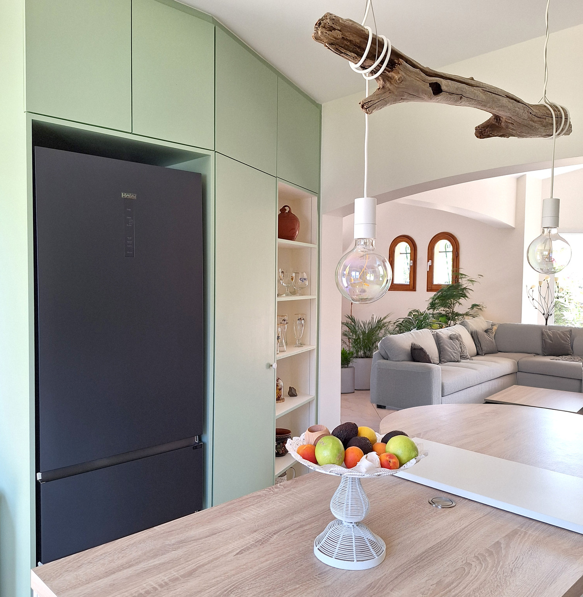Enfin, un module sur mesure abrite le réfrigérateur et crée un rangement supplémentaire, finalisant une cuisine à la fois pratique, esthétique et chaleureuse.