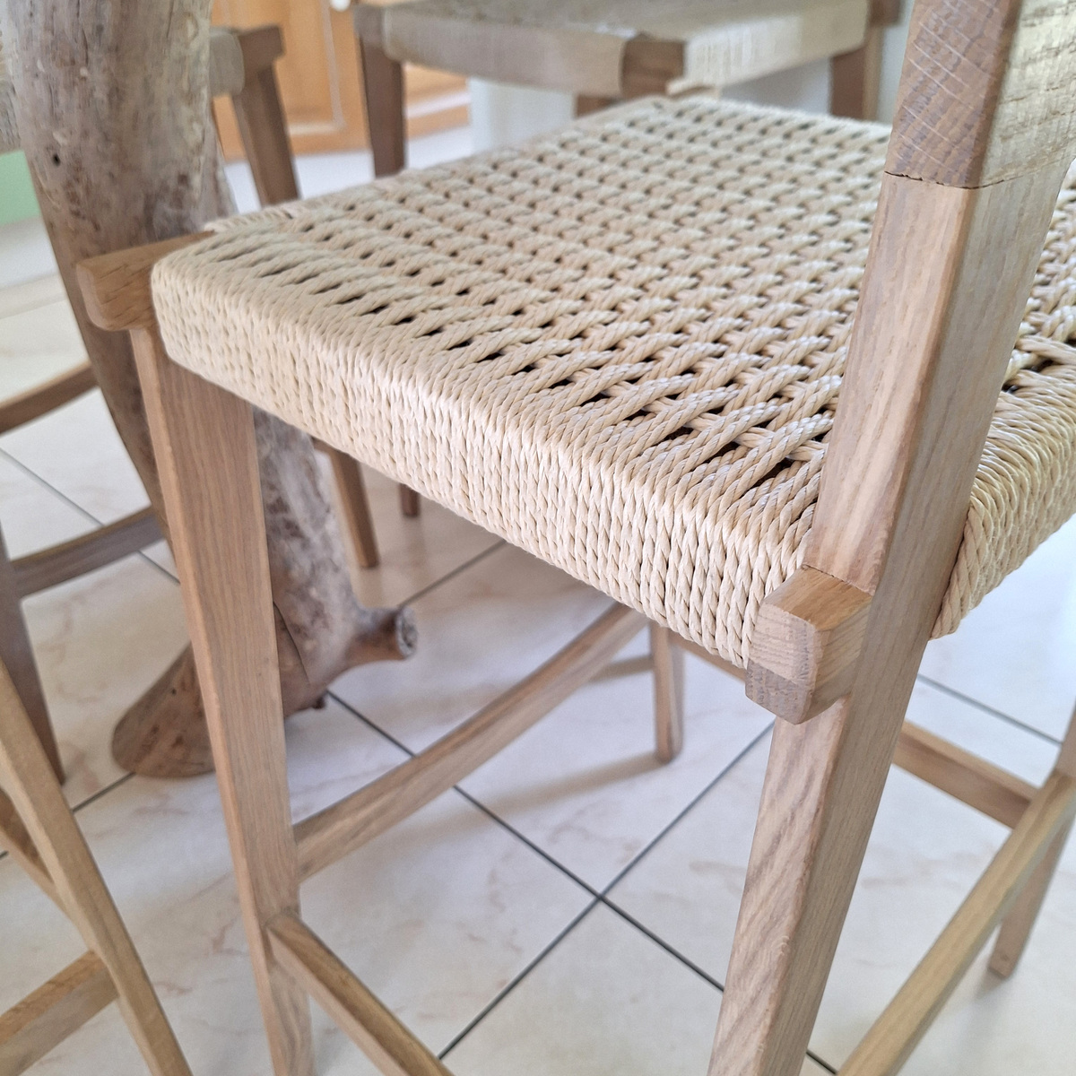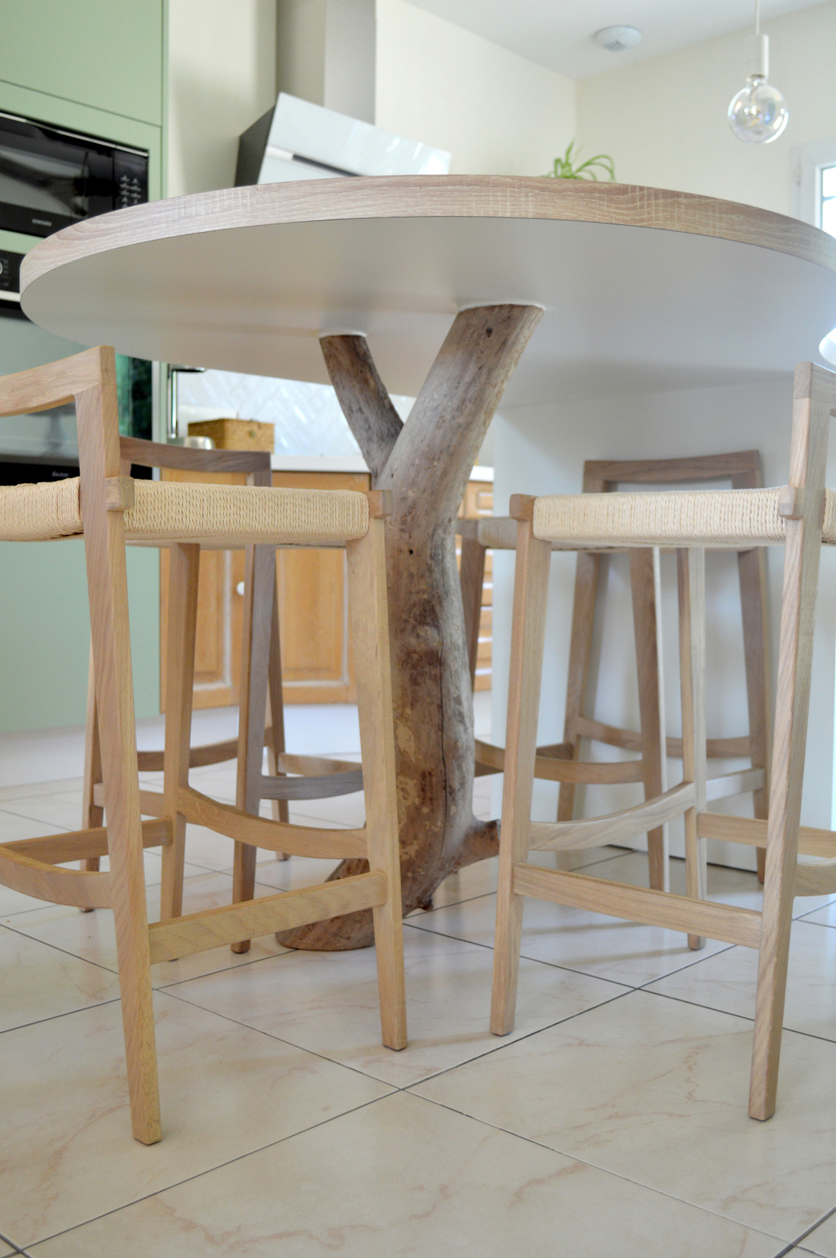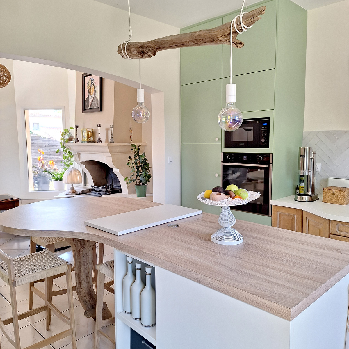 Au centre, un îlot multifonction sur mesure accueille un espace repas, des rangements intégrés et une poubelle dissimulée. Son piètement en bois flotté récupéré sur les plages confère une dimension authentique et artisanale, chère à l’esprit Villa Cap Ouest.