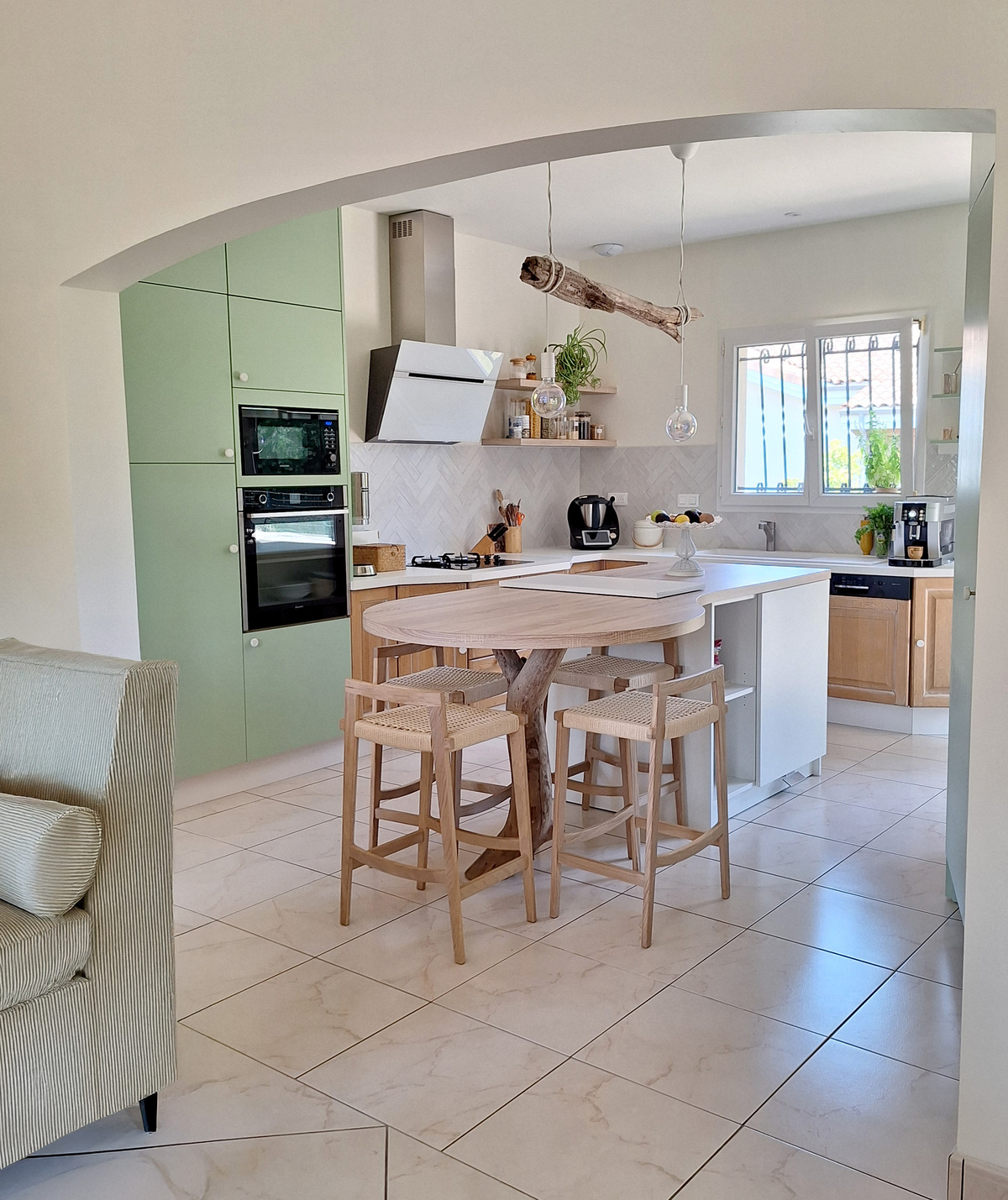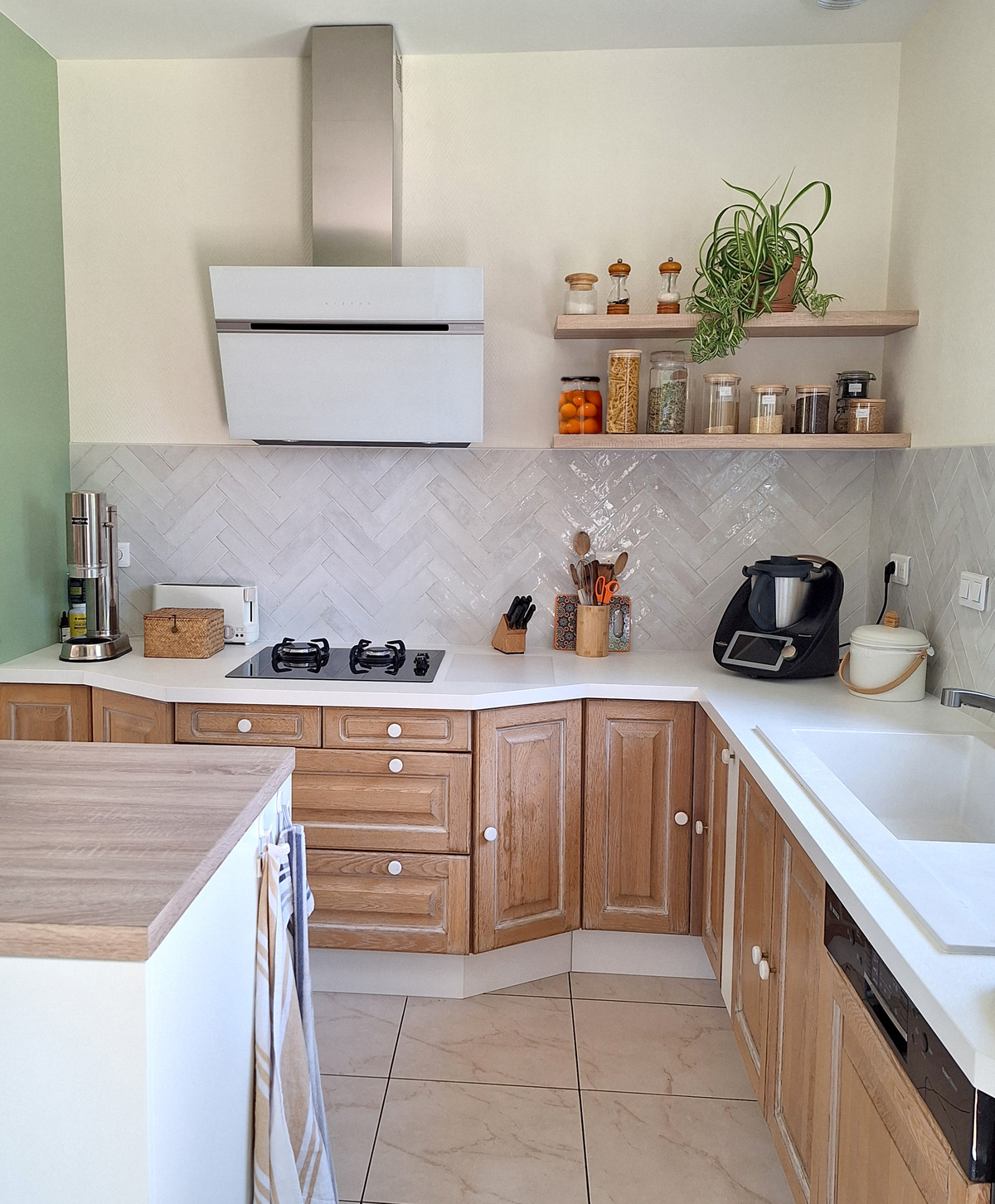 Une crédence en zelliges posés en chevron vient animer subtilement le mur, ajoutant un jeu de matière et de lumière.
