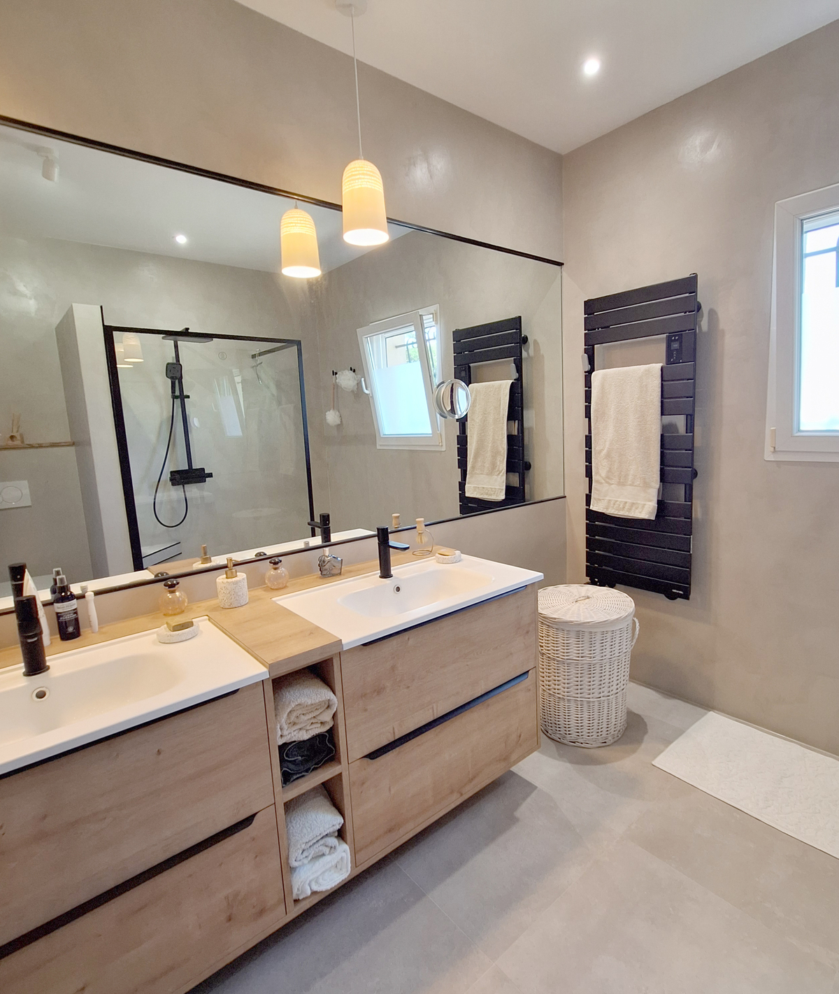 Une douche à l’italienne spacieuse favorise la fluidité des déplacements et le confort d’usage quotidien. Le meuble double vasque sur mesure s’intègre parfaitement aux volumes existants, tout en optimisant les rangements.